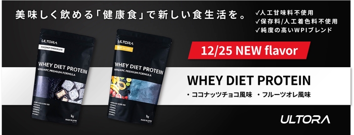 発売以降、圧倒的な味とこだわりで爆発的に国内に広がるホエイダイエットプロテインを展開する株式会社ULTORA(本社:東京都恵比寿、代表取締役:石垣 彩人、以下 当社)は、ホエイダイエットプロテインの新風味と新配合プロテイン、あわせて5フレーバーを2020年12月25日 17:00より発売いたしました。
