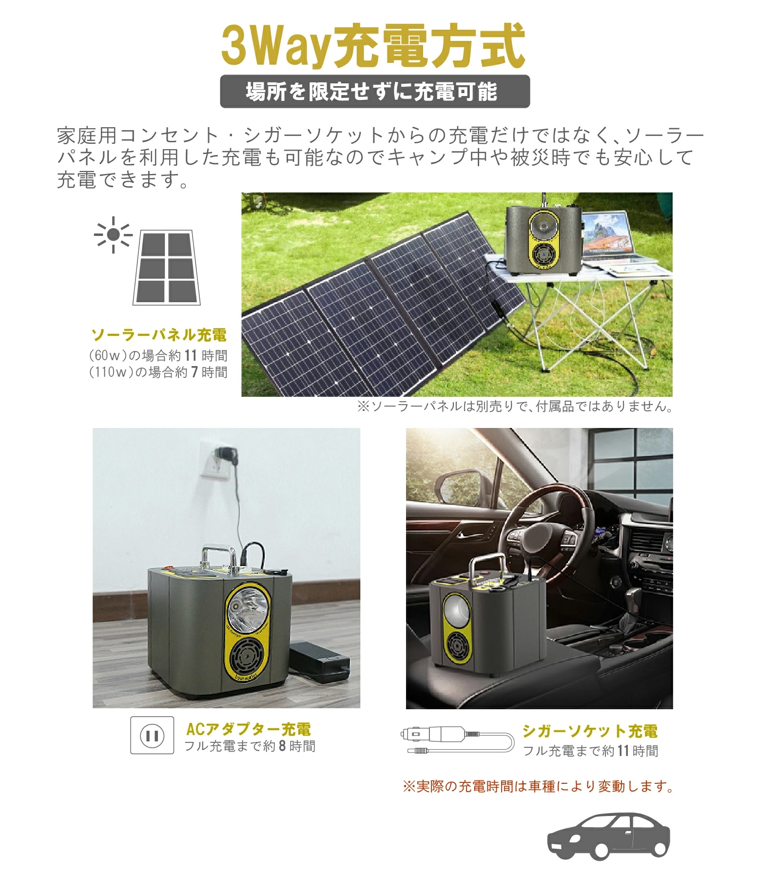 普段は家庭用コンセントから充電しつつ、外出時にはカーチャージャー機能、電源を確保できない非常時や災害時にはソーラー充電機能を活用することであらゆるシーンで電化製品をご利用いただけます。