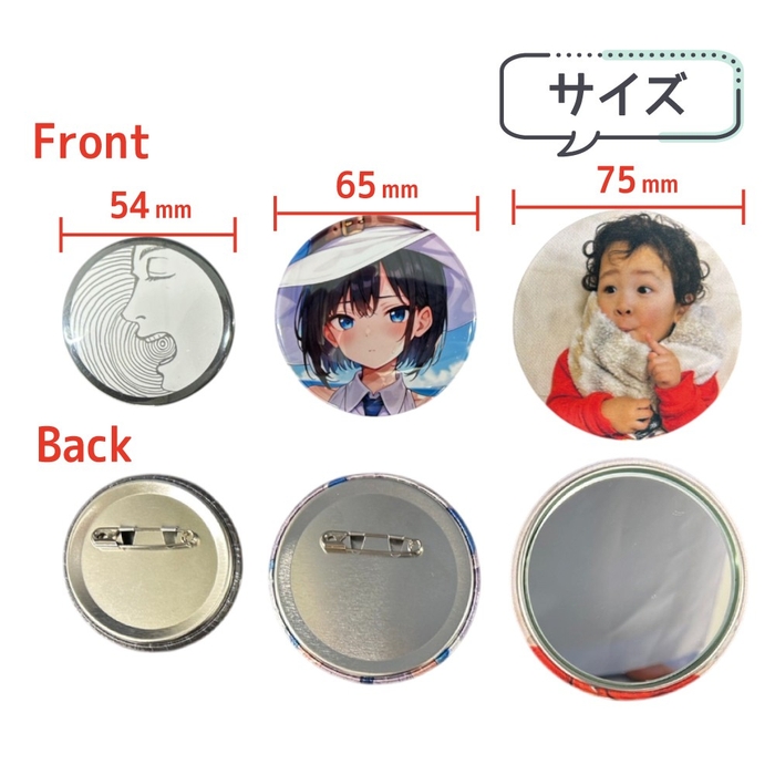 サイズは54mm、65mm、75mmの3種類をご用意しており、75mmは通常の缶バッジとミラータイプの両方があります。