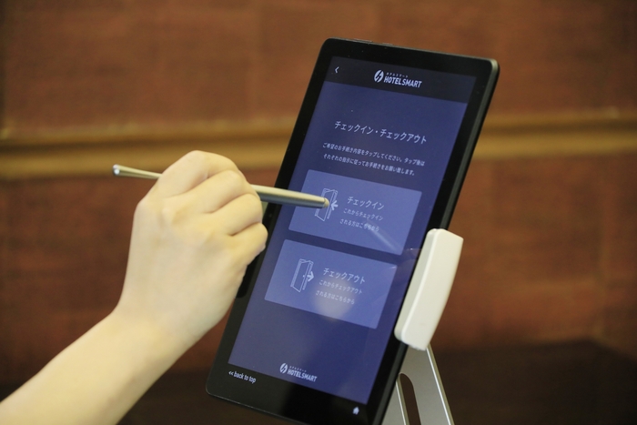 ご宿泊前までにお客様情報をご登録いただきますと、当日はフロントに設置のタブレット端末にQRコードをかざし(またはチェックインコード入力)、電子署名するだけでチェックインが完了。宿泊カードの記入や混雑するフロントでお待ちいただくことを避けられる便利なサービスです。