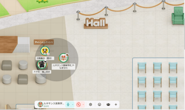 バーチャル空間を使用し場所の制限を無くすことで、全国各地の生徒たちに会うことができ、スクーリングだけではなく日常的に関われる居場所を提供します。また、人見知りや対面での人間関係に不安がある生徒でも、チャット等を通して気軽にコミュニケーションを取ることができるなど、過ごしやすい環境を提供します。