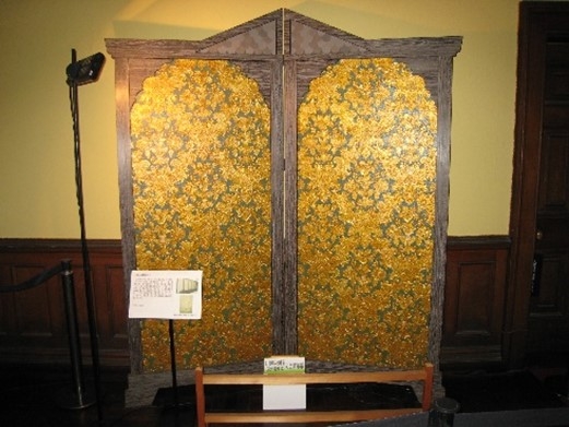 今回は例年より展示をスケールアップし、昭和60年頃から実施されてきた各地の重要文化財復元の際に使用された金唐紙の絵柄を展示します。また、金唐紙の技術を用いた絵画を施した額絵やパネル、茶席で使用される風炉先(ふろさき)屏風なども展示いたします。