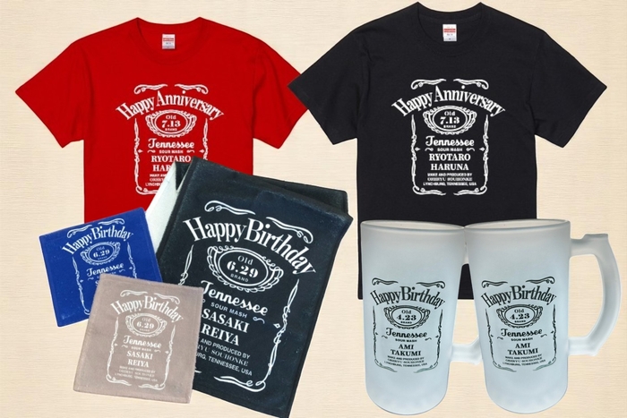 俺流総本家の記念日名入れシリーズは、お二人の名前と大切な日付を品質にこだわった商品に刻み込むことで、一生の記念品に変えるサービスです。お祝いの日の乾杯用のジョッキから、お揃いで着用できるTシャツ、タオルなど、各種ラインナップから選べます。