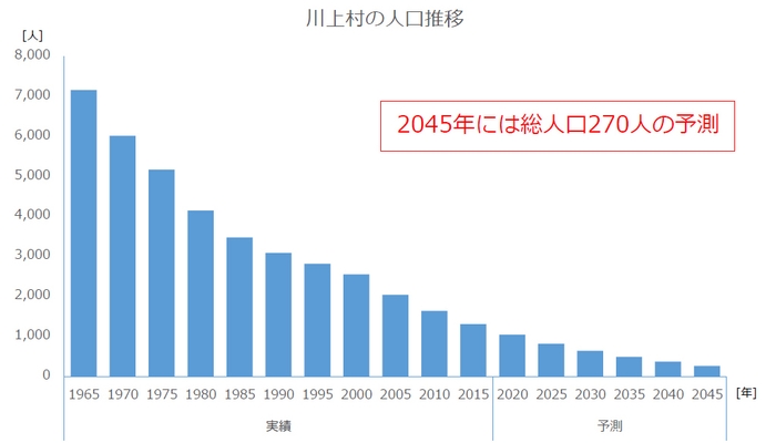 この結果から、2018年には国⽴社会保障・⼈⼝問題研究所が発表した「地域別将来推計⼈⼝」では2045年までの⼈⼝ 減少率で「全国ワースト1」と試算されました。さらに2045年には川上村の総⼈⼝は20215年⽐率で20.6%、270⼈ま で減少するとの予測が出されました。しかし、近年では都市部からの子育て世代の移住・定住の流れもあり、平成26年からの累計では30世帯71名が移住しています。