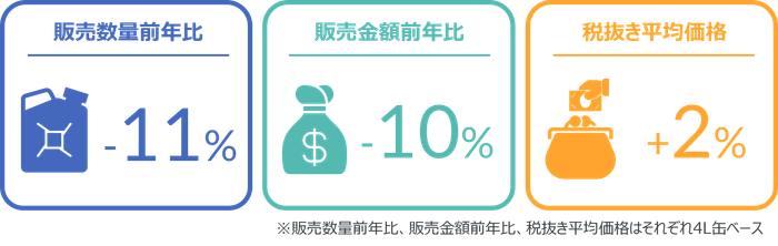 2024年4月の自動車用エンジンオイル販売は、販売量(リットル換算)ベースで前年比13%増と好調であった。ただ、4L缶の販売は数量前年比11%減と不調で、店頭が同11%減、インターネットでは同16%減と大幅に前年を割り込んだ。こうした中ではあるが、0W-16、0W-30の粘度の4L缶販売はそれぞれ数量前年比15%増、18%増と前年から大幅に伸長した。4L缶の税抜き平均価格は4,119円と前年同月から2%上昇した。店頭では3%上昇した一方、インターネットでは2%下落した。4L缶全体の金額前年比は10%減となり、店頭では8%減、インターネットでは18%減であった。