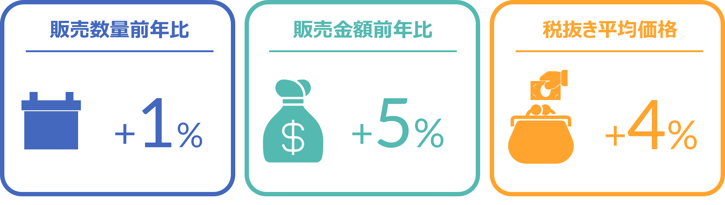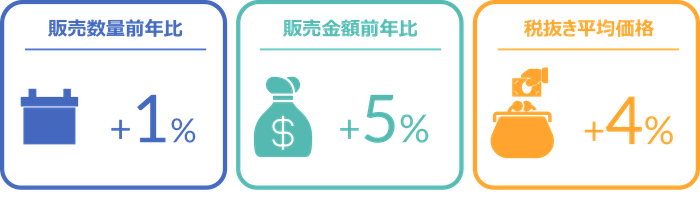 2024年4月の自動車用バッテリー販売は数量前年比1%増と微増で、店頭では2%減であったことに対し、インターネットでは6%増となった。規格別にみると、B20が数量前年比10%増、D26が同16%増と著しく伸長した一方で、B19は同2%減、B24は同7%減と前年を下回った。バッテリー全体の平均価格は前年同月から4%上昇し13,519円となり、店頭では6%、インターネットでは1%上昇した。金額前年比は5%増の微増で推移し、店頭では4%増、インターネットでは7%増であった。