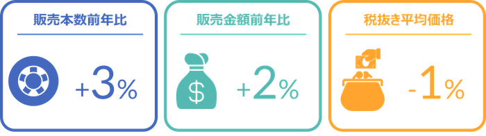 2024年4月の自動車用タイヤ販売は本数前年比3%増と微増で、店頭では同2%増、インターネットでは同5%増であった。夏タイヤは本数前年比7%増に転じ、4月に入って夏タイヤへの履き替えが一気に進んだことがうかがえる。タイヤ全体の税抜き平均価格は10,455円と前年同月から1%下落した。店頭では2%上昇したことに対し、インターネットでは6%下落した。この結果、タイヤ全体の金額前年比は2%増で推移した。店頭では4%増の伸長であった一方、インターネットでは1%減と前年をわずかに下回った。