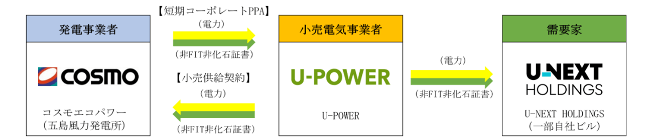 U-POWERとコスモエコパワーは、五島八朔鼻(ごとうはっさくばな)風力発電所(設備容量1,200kW、以下、本発電所)から生まれる再生可能エネルギー全量を3年間にわたり短期コーポレートPPAで供給する契約を締結しました。(※1)また、本発電所の運営において必要となる所内電力について1年間の小売供給契約を締結しました。これにより、コスモエコパワーがFIP制度(※2)で所有・運営する本発電所の発電電力と環境価値を、U-POWERに供給します。あわせて、U-POWERからは、本発電所やU-NEXT HOLDINGS(一部の自社オフィスビル)、U-POWERの取引先である店舗・施設などに再生可能エネルギー由来の電力を供給(実質的な供給を含む)します。
