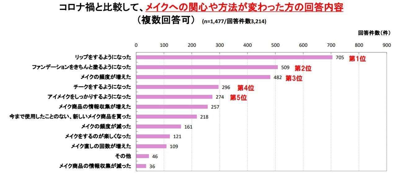 メイクに関する変化は66%、スキンケアに関する変化は52%。メイクをする頻度も「ほぼ毎日メイクをする方」が約67%(1週間毎日する36%、5~6日31%)、「全くしない方」は僅か5%でした。メイクの行動変化のトップ3は、第1位「リップをするようになった」、第2位「ファンデーションをきちんと塗るようになった」、第3位「メイクの頻度が増えた」。スキンケアでは、第1位「化粧水の量が増えた」、「美容液の量が増えた」が並び、第3位「今まで使用したことのない、新しいスキンケア商品を買った」が続き美容への積極的な意欲が感じられた。