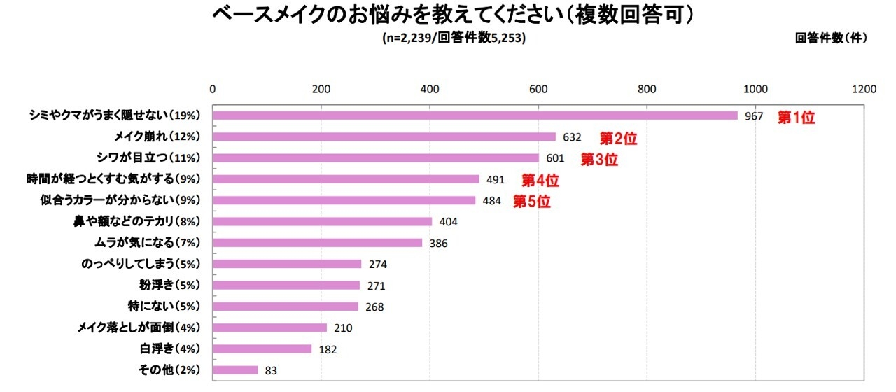 (4)メイクに関する悩みについて、ベースメイク悩みのトップは「シミやクマが上手く隠せない」19%、次いで「メイク崩れ」12%、「シワが目立つ」11%で、肌悩みとの関連性が強い傾向。