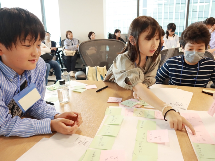 続く「LOOP」では、社会の中でお金がどのように回っているかを付箋を使って可視化し、経済の循環構造や「お金の力」に気づくワークを展開。子どもたちは主体的に意見を出し合い、初対面の友だちとも協力しながら学びを深めていました。