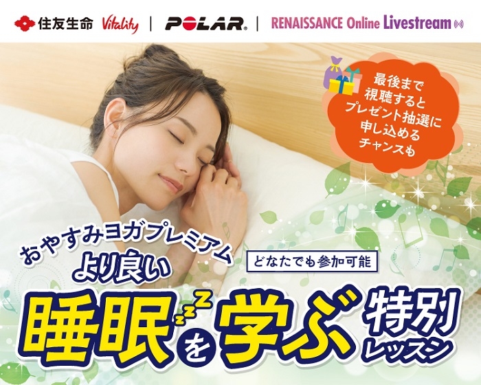 本イベントでは、睡眠に関するセミナーとオンライン配信サービス「RENAISSANCE Online Livestream®(以下「ルネサンス オンライン ライブストリーム」)」で大人気のオリジナルプログラム「おやすみヨガ」をオンライン配信にて実施します。「睡眠」の分野を当社、その「計測」「フィードバック」に関してウェアラブルデバイスのPolar、そして人々の「健康づくり」を応援するための健康増進型保険“住友生命「Vitality」”を取り扱う住友生命が共催することで、本イベントを通じて「睡眠」の改善から人々の健康づくりのきっかけになることを目的としています。さらに、最後まで参加された方には、本イベントだけのオリジナルのプレゼントが当たるチャンスがあります。