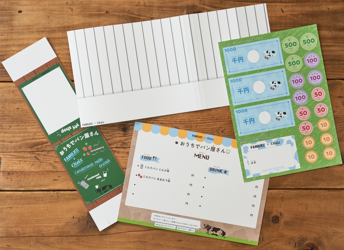 お子さまがパン職人になった雰囲気を味わえるコック帽やお店の看板をご用意しました。オリジナルのお札・コイン・メニュー表も付いてくるので、作って食べて遊びながら食育にも役立ちます。