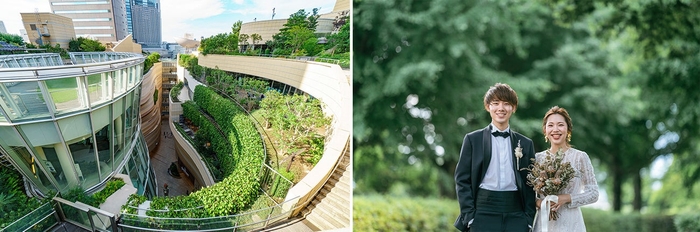 さらに、なんばパークス内にある約3,500坪の広大な庭園「パークスガーデン」内でも撮影可能。国内外からも高い評価を受け、都市のオアシスとも称されるパークスガーデンの緑に囲まれながら、リラックスして撮影をお楽しみいただけます。また、なんばパークス近郊でも撮影可能で、和装は大阪城や大仙公園、洋装は鶴見緑地公園や中之島公園など人気のロケーションでも撮影いただけます。