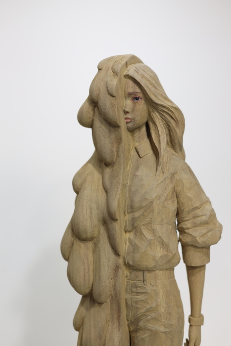 本展では、前回の展示に引き続き、人間関係における表に見せている部分と、隠された内面を表すHalf and Halfシリーズを探求します。稲葉は、人物の顔や髪、服装の細部を彫ることに喜びを見出しています。彼の作品に登場する人物は、日常的な装いや仕草をまとった普通の人々であるようにもみえます。その普通さが作品との距離を縮め、体裁的な表面と秘めた感情や思考が交錯する感情を鑑賞者にリアルに示します。