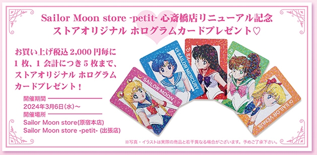 リニューアル記念として、お買い上げ税込2,000円ごとに1枚、1会計につき5枚まで『ストアオリジナル ホログラムカード』 をSailor Moon store(原宿本店)と Sailor Moon store -petit-(出張店)心斎橋店にてプレゼントいたします。