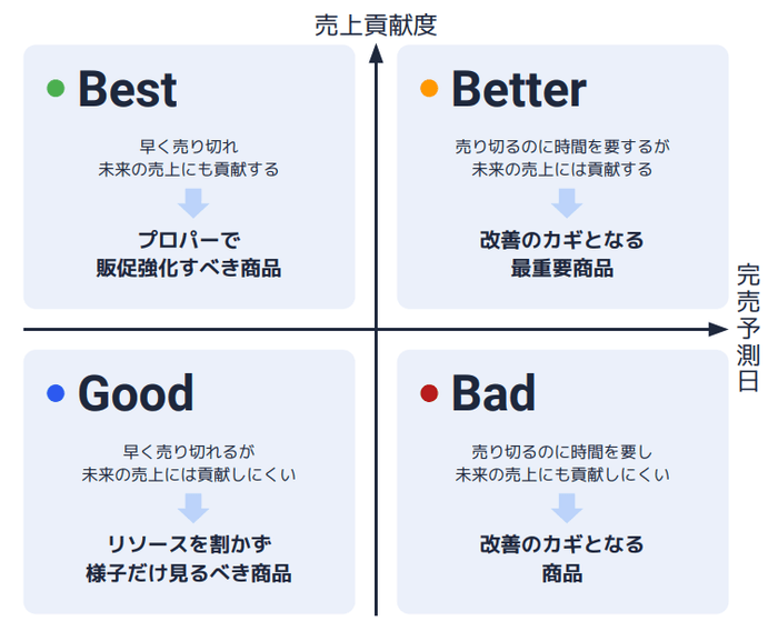 中でも「Better」に分類された在庫は、隠れた売れ筋商品であるため、販促を強化することで今ある在庫から売上や粗利を増加させることができます。これらを中心に販促を強化することで今ある在庫から売上や粗利を増加させることができます(下図は一例)。
