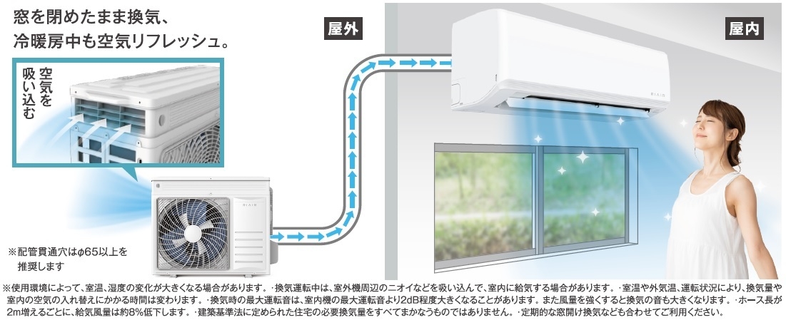 室外機から外気を取込み、室内へ新鮮な空気を届けます。冷暖房中でも、換気のみでも運転が可能なので、窓を開けずに換気ができます。(※)