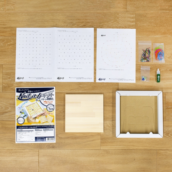 板(赤松集成材 20×20cm)1枚、釘(22種類アソート)100本、わごむ(ピンク/オレンジ/ライトグリーン/ブルー)各12本、ネイルガイド、ビー玉 直径12.5mm 3個、パターンシート 3種類、説明書、クラフトフレーム(20×20cm ホワイト)