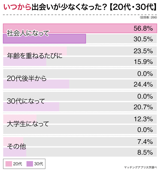 どのようなタイミングで出会いが少なくなったかについて、20代・30代では「社会人になってから」との回答がもっとも多くなりました。