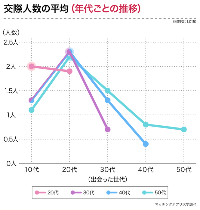 交際した平均人数に関しても20代がもっとも多く、40代以降は格段に減っているのがわかります。