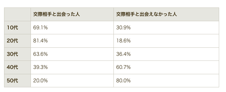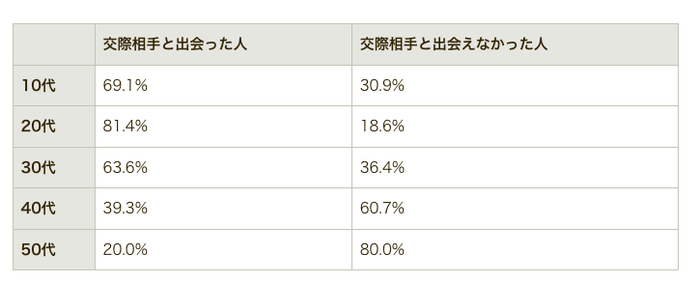 また「交際相手と出会った人・出会えなかった人」を年代別に調べてみたところ、以下の通り40代で約40%、50代では20%の人が交際相手と出会っていることがわかりました。