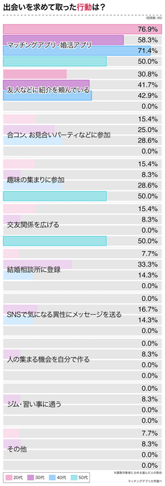 20代から40代で2番目に多かったのは「友人に紹介を頼む」で、50代では「マッチングアプリ」と同率1位で「趣味」「交友関係を広げる」でした。出会うための行動は、年代による大きな違いはないようです。