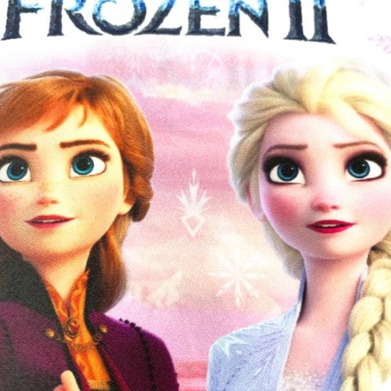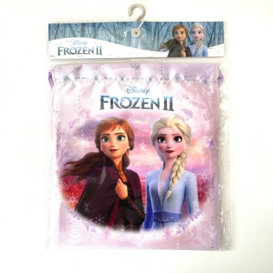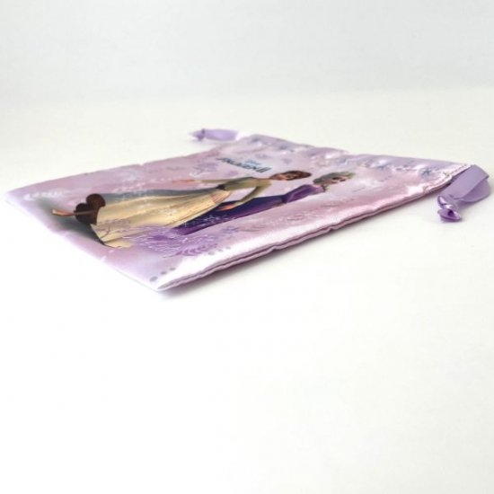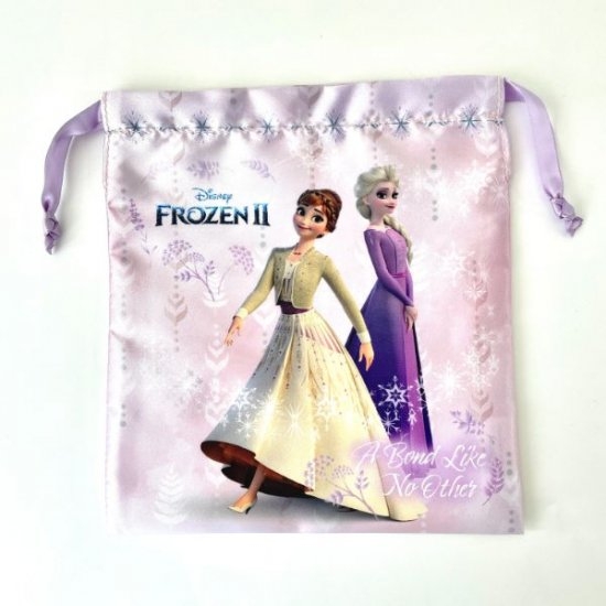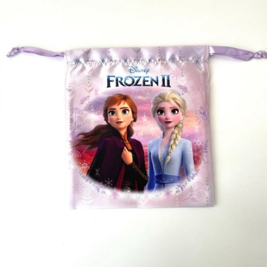 まずはおしゃれ巾着からご紹介します。表面にはアナと雪の女王2の有名なビジュアルがプリントされており、裏面にはドレスアップしたアナとエルサが描かれています。ところどころに散りばめられた雪の結晶や、植物のデザインが美しいですね~♪