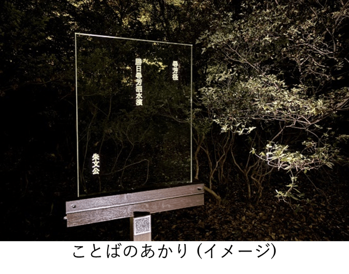 内容:アクリル導光板に六義園八十八境の由来となった和歌を映し出し、空中に光で書かれた和歌が浮かび上がったかのように演出します。