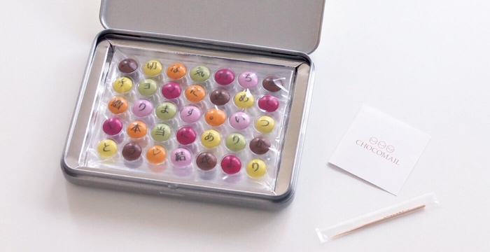 「チョコメール」は専用サイトから注文する際に、入力フォームに文字を入力するだけで、そのメッセージをそのままカラフルな小粒のチョコにフードプリントするサービスです。トレーにのせたメッセージチョコを、ギフト缶と専用ボックスにいれてお届けいたします。