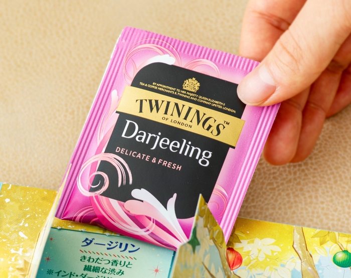 カレンダーは、1日ごと小窓になっており、扉をあけると24種の紅茶やノンカフェイン ティーなど、トワイニングが厳選したバリエーション豊かな味わいが1袋ずつ入っています。ティー バッグを取り出すと、かわいいデザインとともにブレンドの紹介やおいしい いれ方が書かれており、“今日はどんな味に出会えるのか” 、プレゼントを開けるようなワクワク感を最後までお楽しみいただけます。