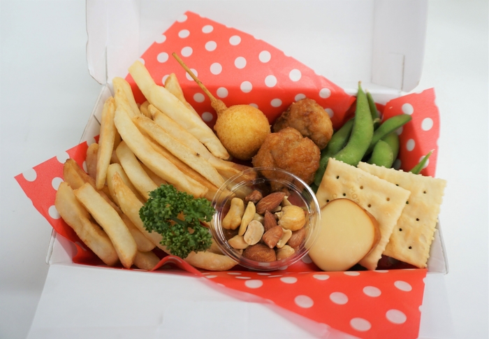 ポテト、から揚げ、枝豆、チーズドッグ、ナッツ、チーズ、クラッカー