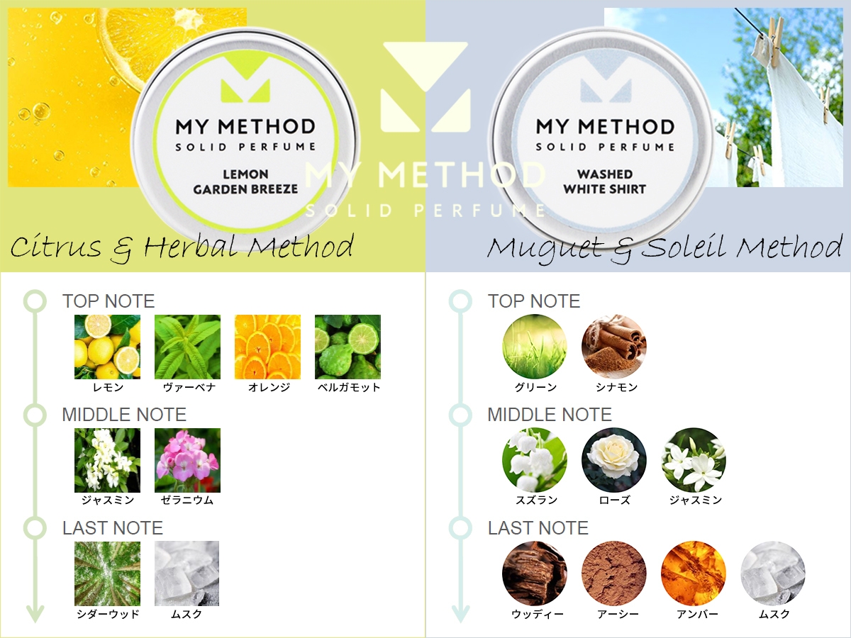印象:ウォッシュド ホワイトシャツのお花の香りを、レモン ガーデン ブリーズの柑橘の香りですっきりと。特に夏にオススメできる爽やかな香りに。