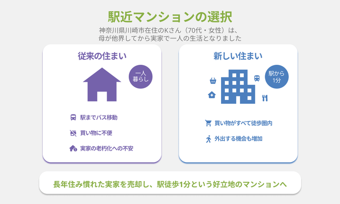 ③実家を売却し駅チカマンションに住み替え|便利な生活を送ることができ、より良い老後の第一歩に