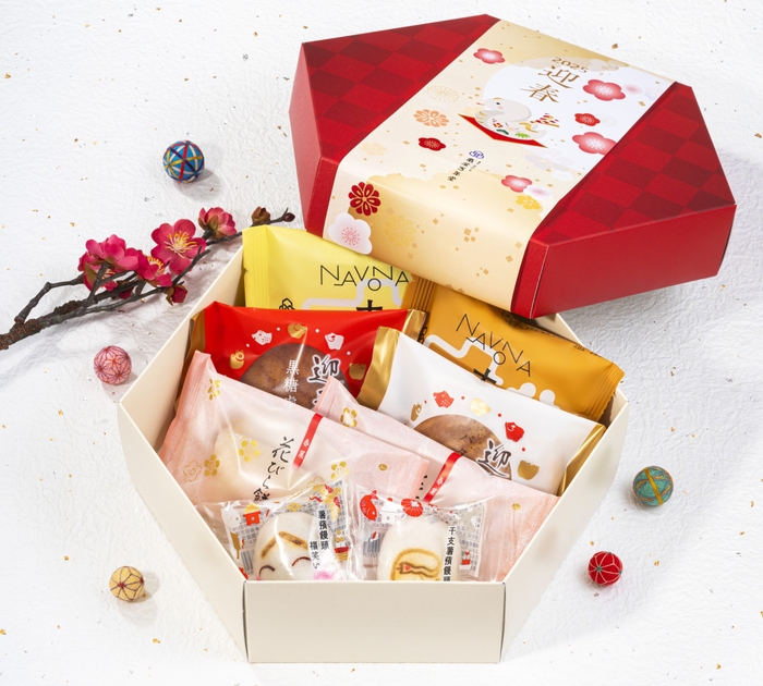 【商品内容】ナボナ(チーズ・マロン)/ 迎春黒糖虎焼 / 迎春バター虎焼 / 花びら餅 / 干支薯蕷饅頭 巳 / 福笑い