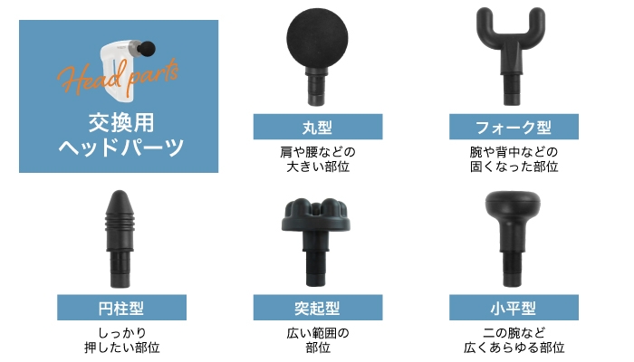 肩・腰・背中・太もも・腹などの使いたい部位に応じてヘッドパーツを交換できます。