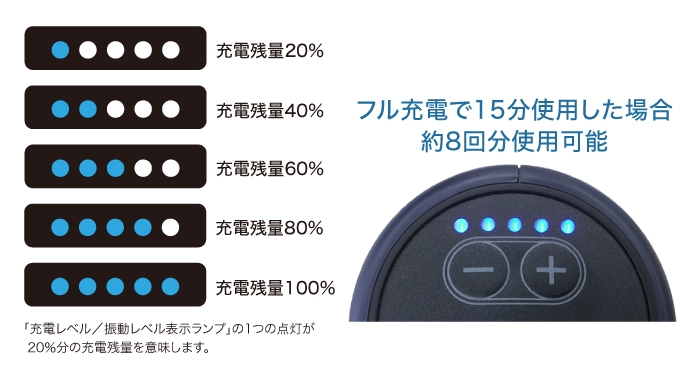 本体を起動した状態で「電源ボタン」を3秒間長押しすると、電池残量が表示されます。点灯したランプの数で電池残量がすぐにわかるので、急な電池切れが防げます。フル充電で1回15分間使用した場合、約8回お使いいただけます。
