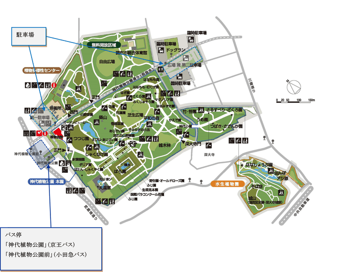 ・調布駅から小田急バス吉祥寺駅または三鷹駅行き「神代植物公園前」下車、または京王バス深大寺行き「神代植物公園」下車