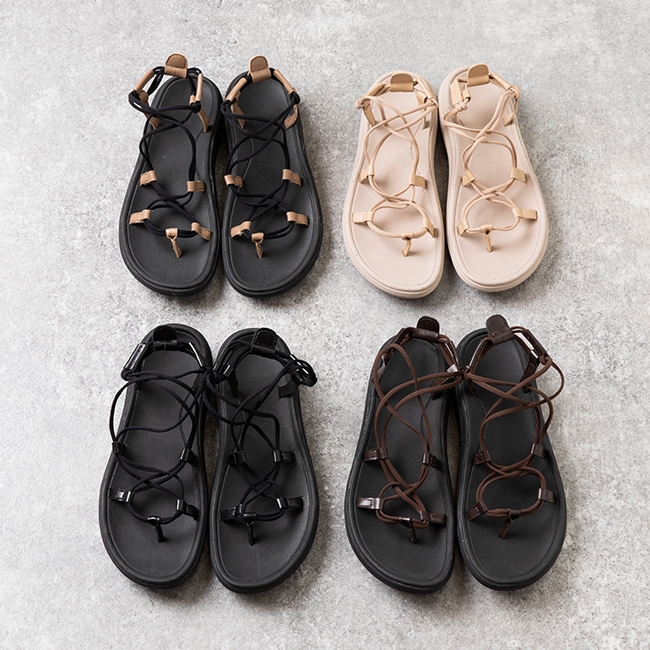 細いレースアップとボリューム感のあるソールのコントラストが印象的な、フラットスポーツサンダル。ストラップの長さにこだわって脱げにくくきつく感じにくい、足を包み込むようなフィット感を追求しました。