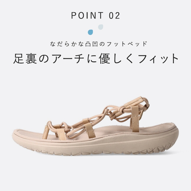 快適な履き心地を追求したストラップスポサンの登場です。 肌触りがよいストラップは締め付け感少なく脱げにくい、足を包み込むようなフィット感を追求しました。足のアーチに合わせてなだらかにカーブしているので足入れした途端に馴染む感覚です。