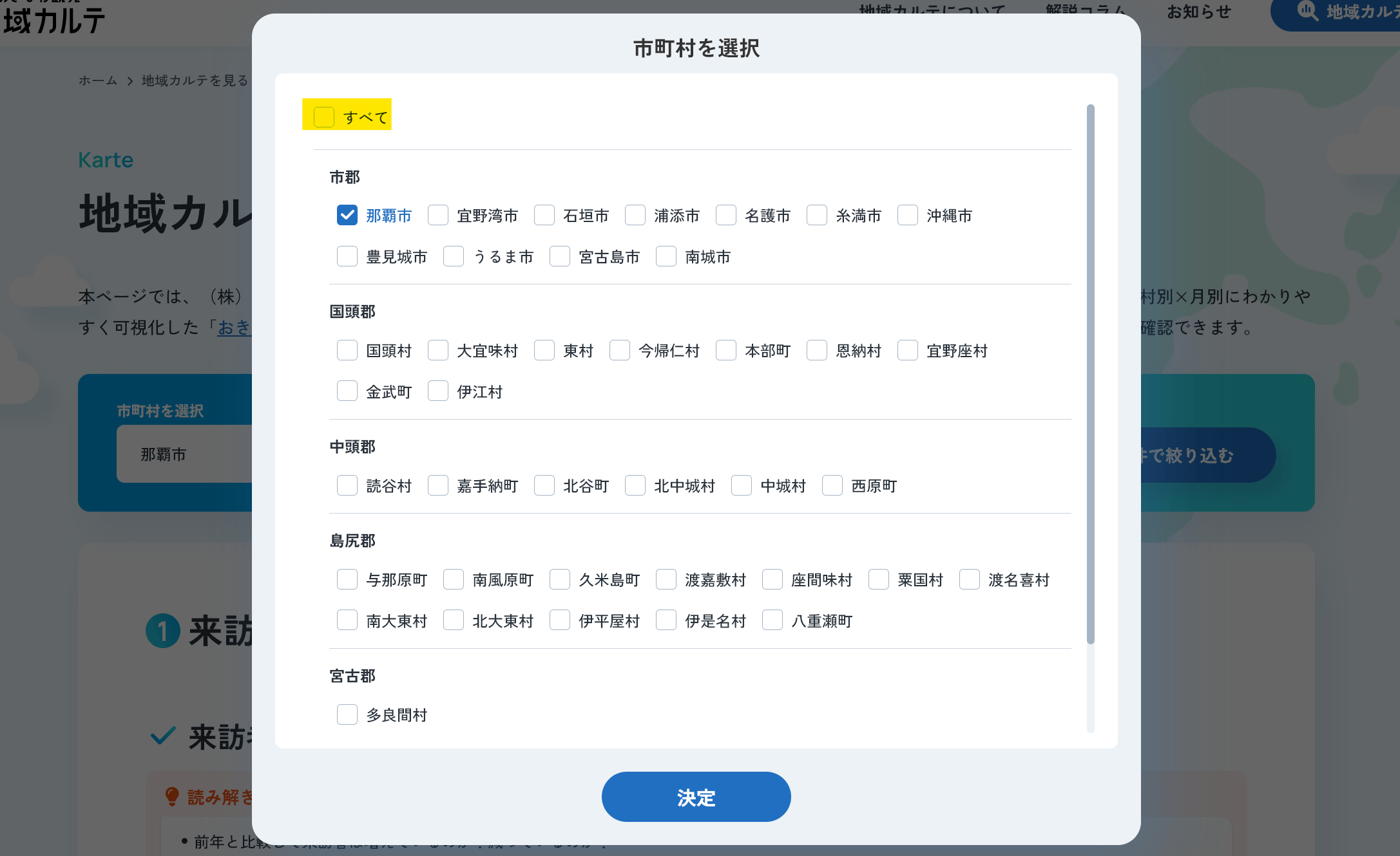 これまで市町村別カルテのみの提供でしたが、県全体と自市町村の差分等を把握したいというニーズに応え、「すべて」で沖縄県全体の分析結果を見られるようになりました。