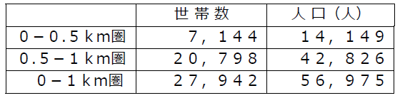 ・店舗から1km圏内は単身世帯比率が46.4%、2人世帯比率は24.5%と全体の7割が少人数世帯