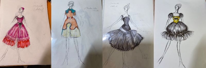 「1幕は振付家・宝満直也がインスパイアされた カンディンスキーの絵画からその遊び心、色使いを衣装のモチーフにとりいれ、2幕のファッションショーや社交場のシーンでは、主役のエラ以外黒がベースのドレスになっています。