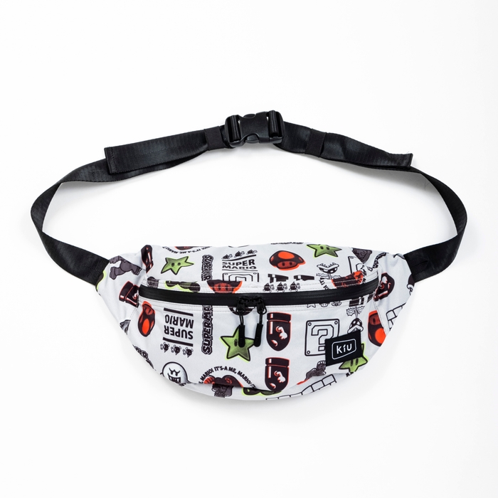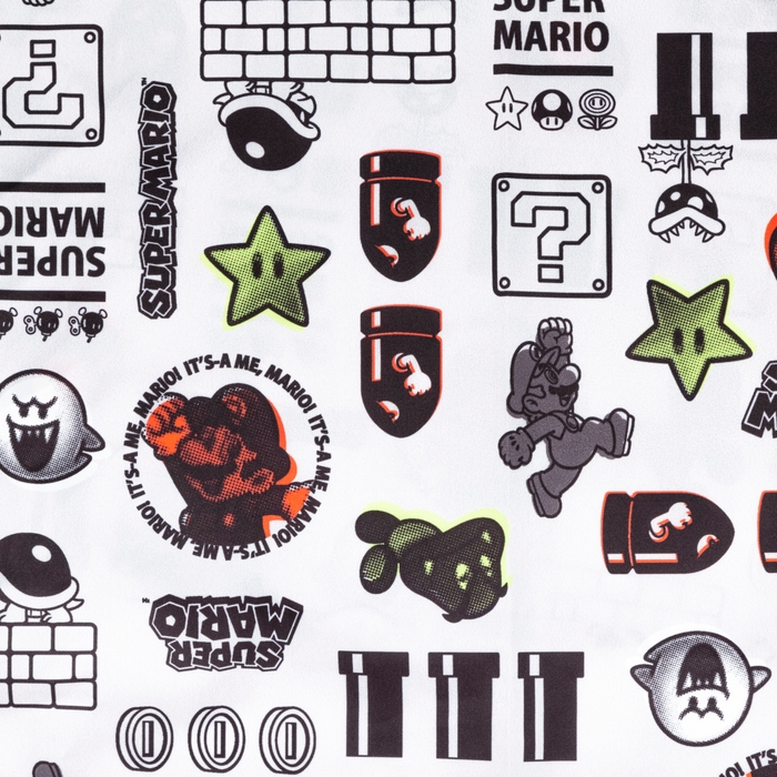 マリオなどのキャラクターをはじめ、キノコやスターなどアイコニックなモチーフを散りばめた柄。クールな印象の中に、こちらを見ているテレサや転んでいるクリボーなども愛くるしいアイテムです。