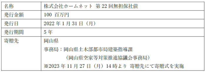 テクノロジーで気軽な住み替えをサポートする株式会社 property technologies(以下「当社」)のグループ会社である株式会社ホームネットは、株式会社中国銀行(以下「中国銀行」)を引受先とする、SDGs私募債「地域応援型」を発行し、発行手数料の一部を岡山県へ中国銀行と連名にて、岡山県の「空き家問題」の解決に向け寄付し、2023年11月27日(月)に寄贈式を行いました。