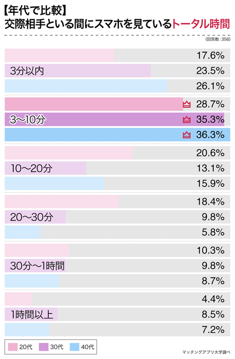 デート中のスマホ閲覧は、5割以上の男女が10分以内