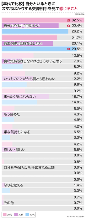 また、20代では「怒りを覚える」という回答がありませんでしたが、30・40代はわずかながら「怒りを覚える」という回答があり、デート中のスマホ閲覧に対する嫌悪感は年齢を重ねるほどに強くなる傾向が見て取れました。