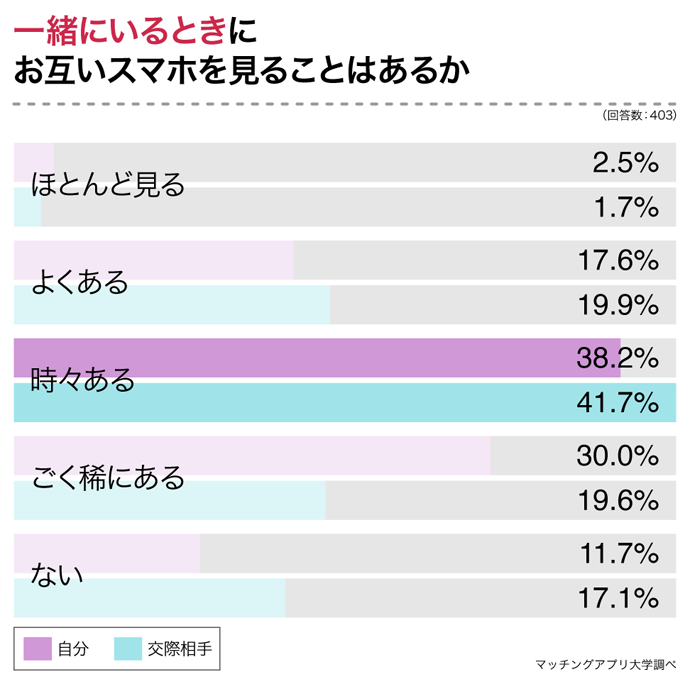 これまでは「彼氏・彼女が自分といる時間にスマホばかり見ていて悲しい」と悩んでいた人も、今回のアンケートで「交際相手が自分といる時間が楽しくないと思っているとは限らない」ということが分かったのではないでしょうか。