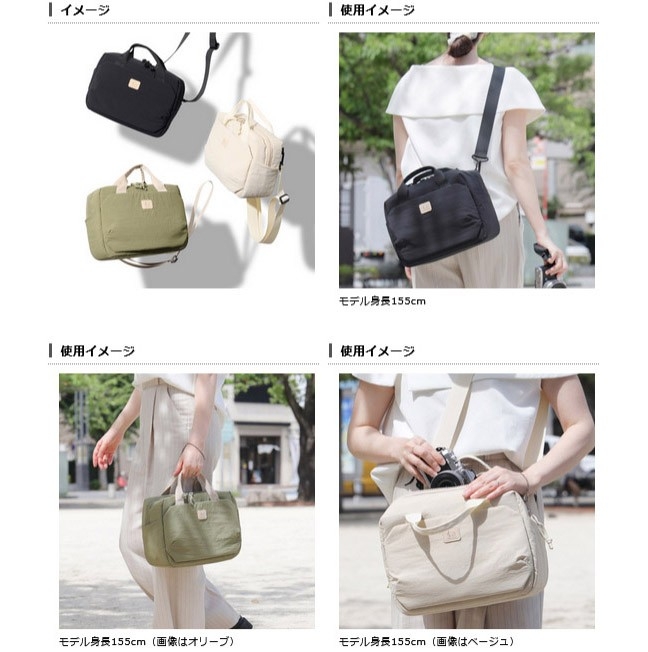 ミラーレス一眼カメラと交換レンズ、財布やスマートフォンなどを収納するのにちょうどいいコンパクトなサイズ感で、カメラを使わない日も普段使いのバッグとして活躍します。