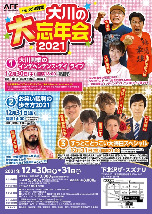 大川興業株式会社(代表:大川豊)主催による『大川の大忘年会2021』が2021年12月30日 (木) ~2021年12月31日 (金)にザ・スズナリ(東京都世田谷区)にて上演されます。チケットはカンフェティ(運営:ロングランプランニング株式会社、東京都新宿区、代表取締役:榑松 大剛)にて発売中です。